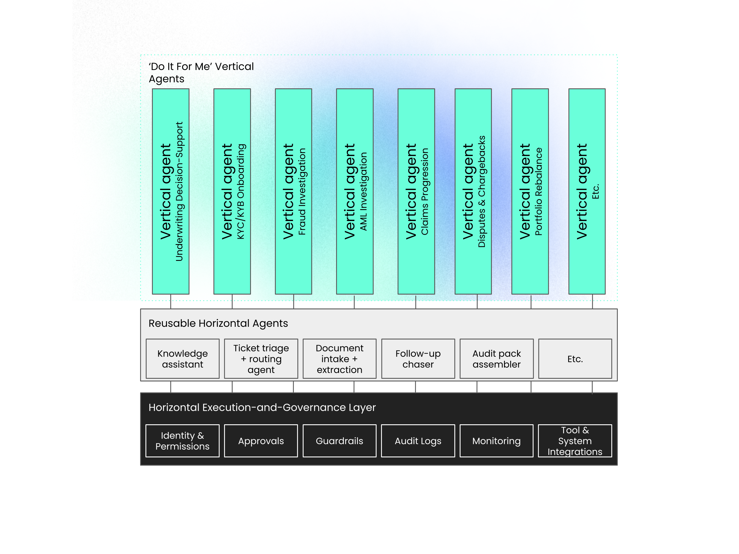 Once that foundation exists, firms can roll out vertical agents that deliver outcomes in specific workflows by layering domain rules, evidence standards, and exception handling on top of the same horizontal “action infrastructure.” In practice, AI that “does” pushes financial players toward a simple pattern: one horizontal execution-and-governance layer enabling multiple vertical, value-driving agents.